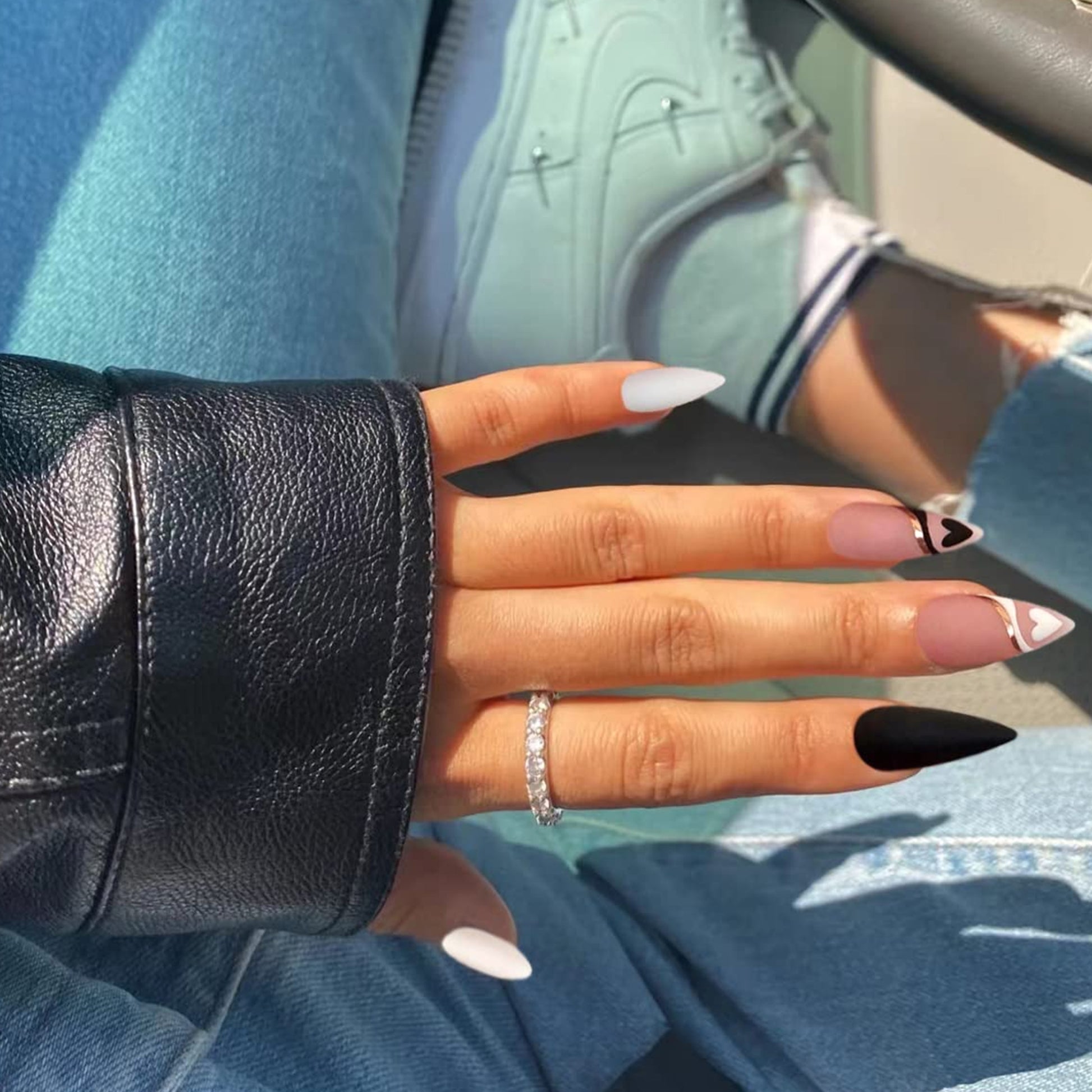 Craft a Captivating Look: Create a stunning nail look by combining a heart design with black and white French tips and gold lines. The matte finish gives your nails an exquisite, modern touch.