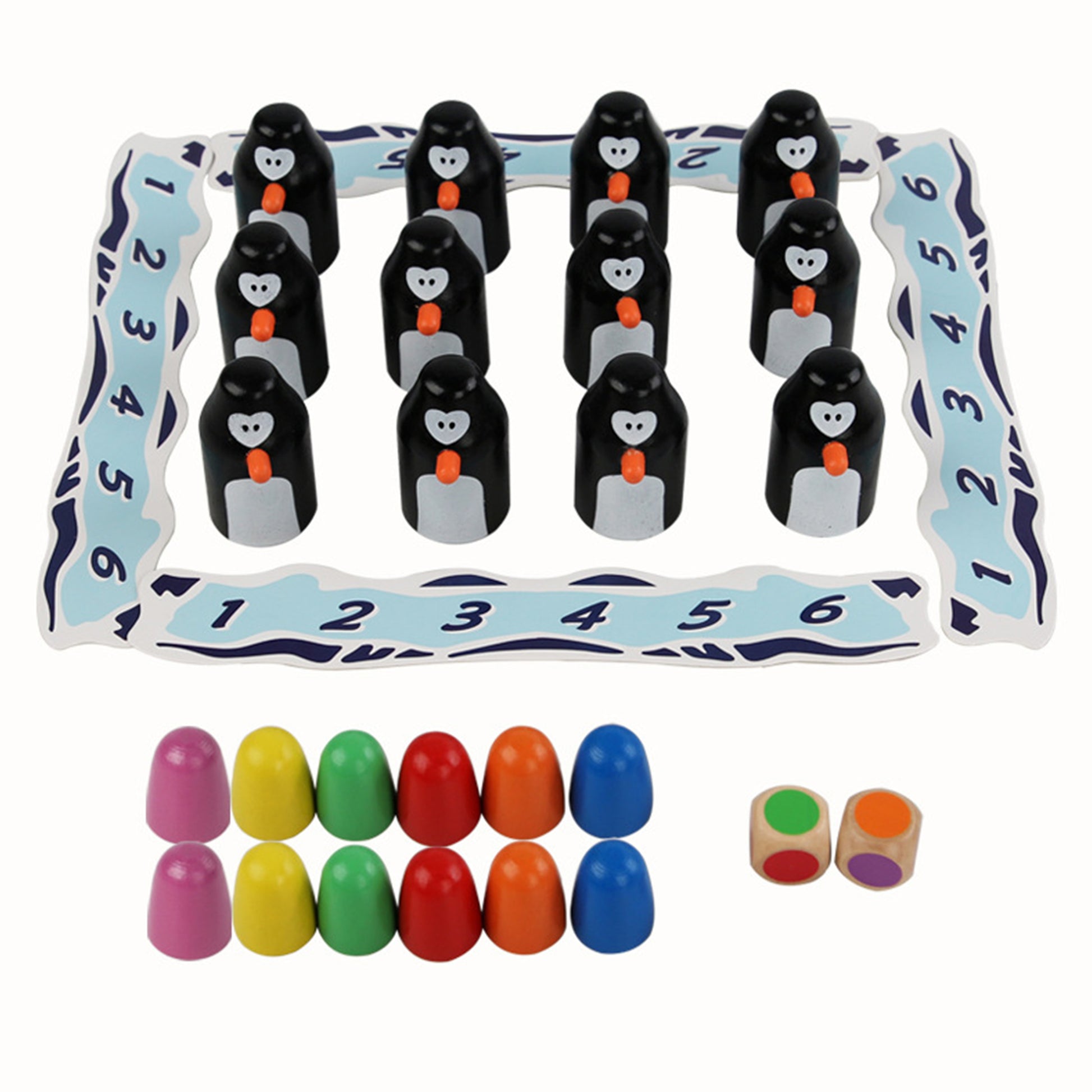 To play, each participant receives their own wooden iceberg. The goal is simple: be the first to collect six penguins on your iceberg to win! Roll the colored dice and lift the wooden penguins, hoping to reveal a matching colored egg. Remember the egg's position to increase your chances of success.
